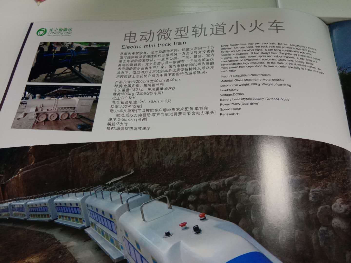 下圖是我們龍之盈游樂公司生產(chǎn)的電動微型軌道小火車的圖冊介紹,我拍的不是很清晰,在給你們詳細的介紹一下吧,軌道火車很多游樂場里面都有,但是龍之盈的卻不同。軌道小火車因一個方面可提供給游客便捷的代步服務(wù),另一方面又可為投資者帶去可觀的經(jīng)濟效益,一直是公園、廣場、景區(qū)、室外商場投資的*選。