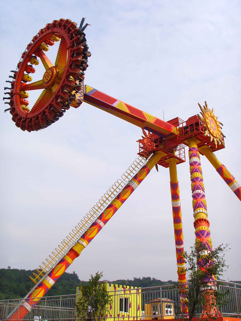 大擺錘:游樂(lè)中經(jīng)典的大擺錘,對(duì)于常去游樂(lè)園的人并不陌生。他的游樂(lè)方式是巨大的鐘擺伴隨著旋轉(zhuǎn)大幅度的往復(fù)搖擺挑戰(zhàn)心理的極限。在極易失去重心的高空中乘客門(mén)隨著擺錘搖擺的弧度,游客往往情不自禁的發(fā)出驚呼與歡笑,極大的提高了整個(gè)游樂(lè)場(chǎng)的歡樂(lè)氣氛,使許多游客留連忘返,不愿離開(kāi)。
